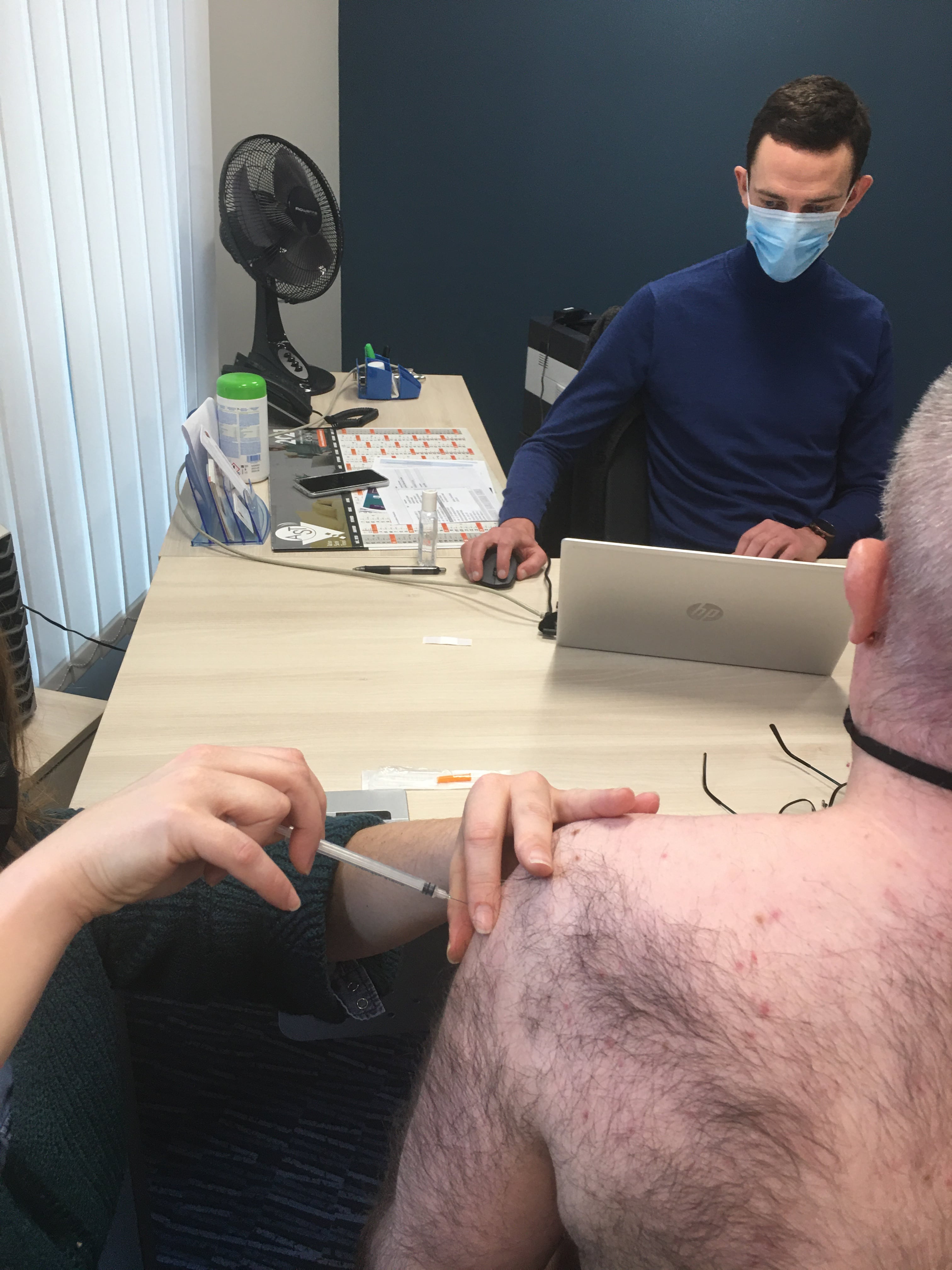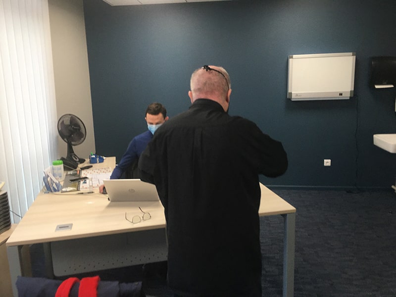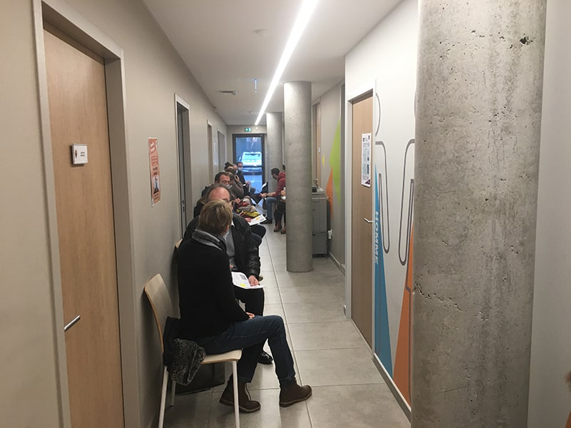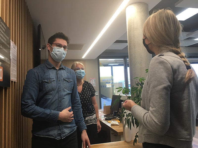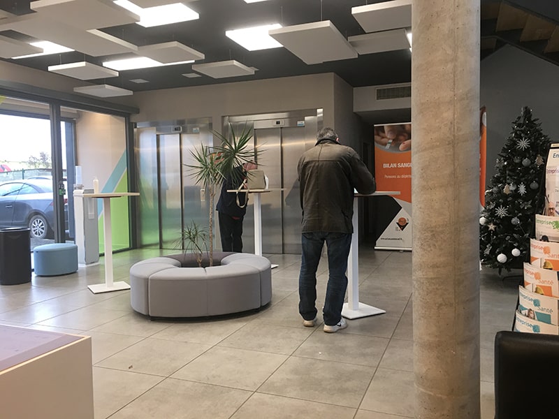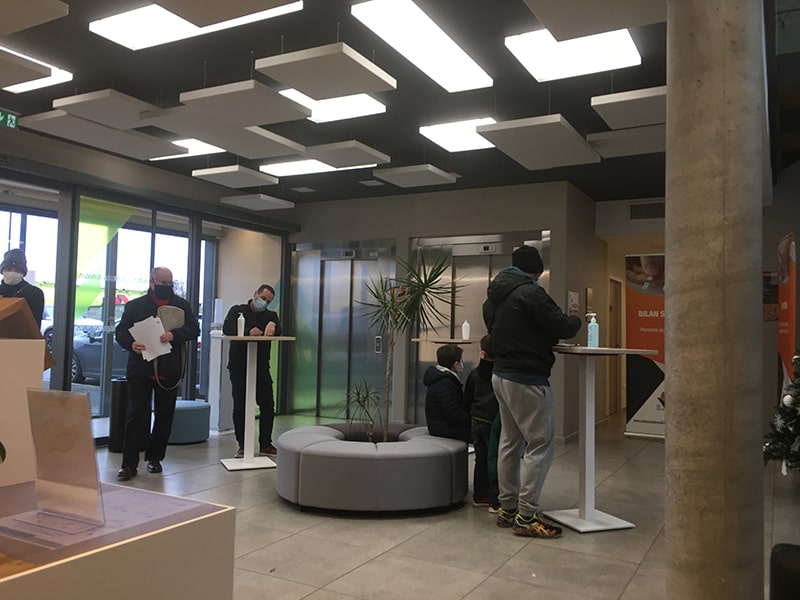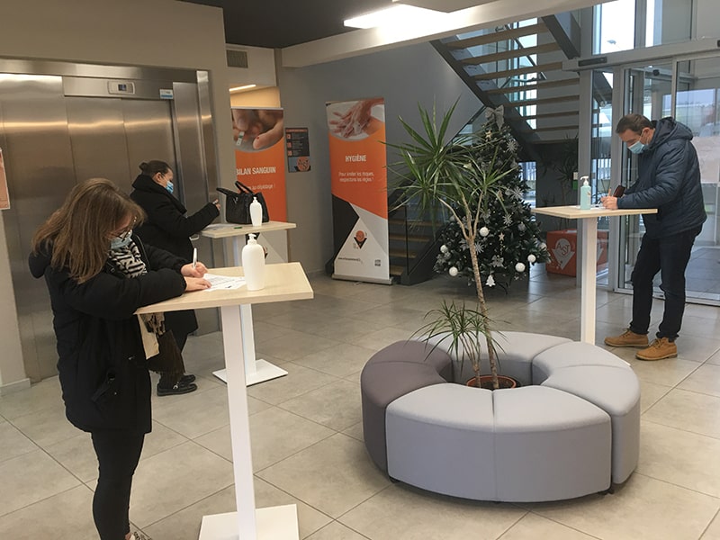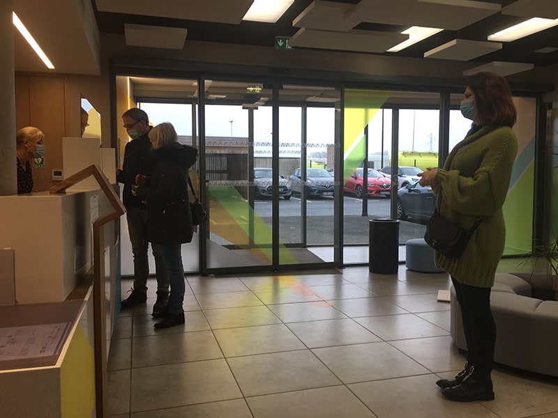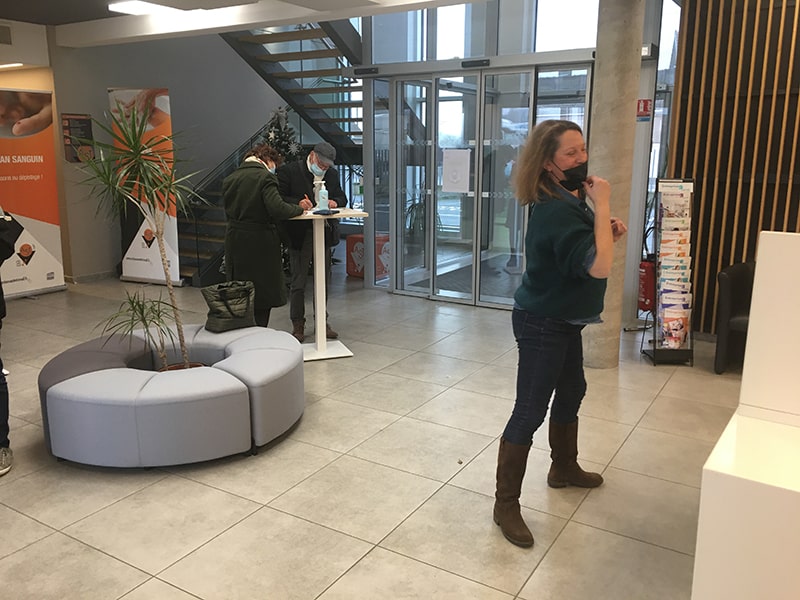 • arrivée dans le hall d'AST, accueil par l'hôtesse, vérification du rendez-vous, remise du questionnaire à remplir et de la fiche d'information sur les effets indésirables du vaccin- le questionnaire est rempli sur des tables individuelles placées dans le hall d'accueil