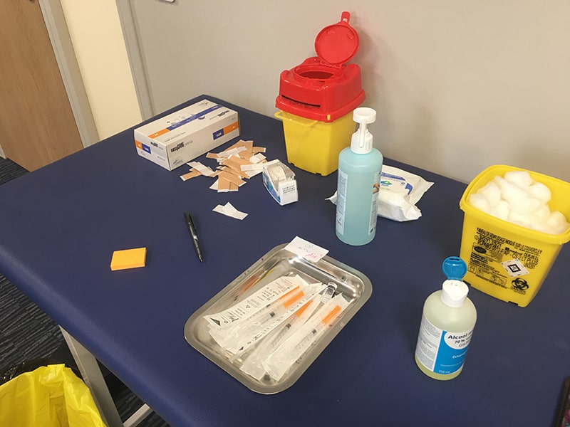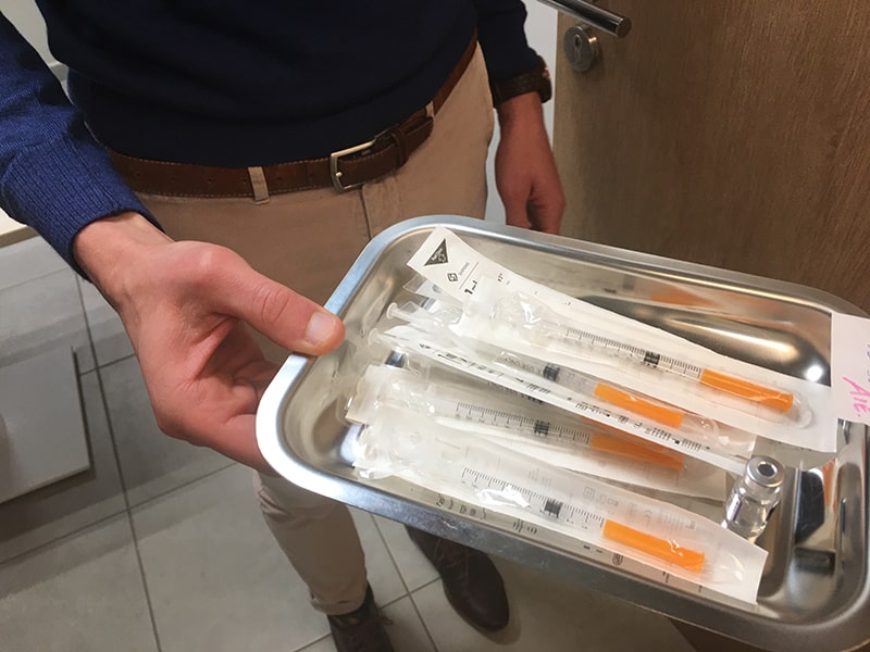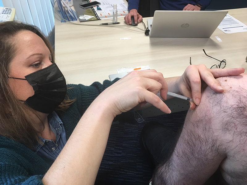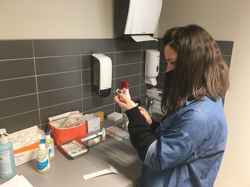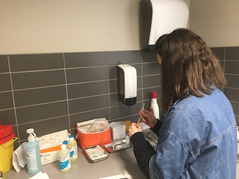 • orientation dans la zone de surveillance des 15 minutes après l'injection (la secrétaire médicale s'assure de l'attente de contrôle effective avec infirmier(ère) et médecin à proximité)